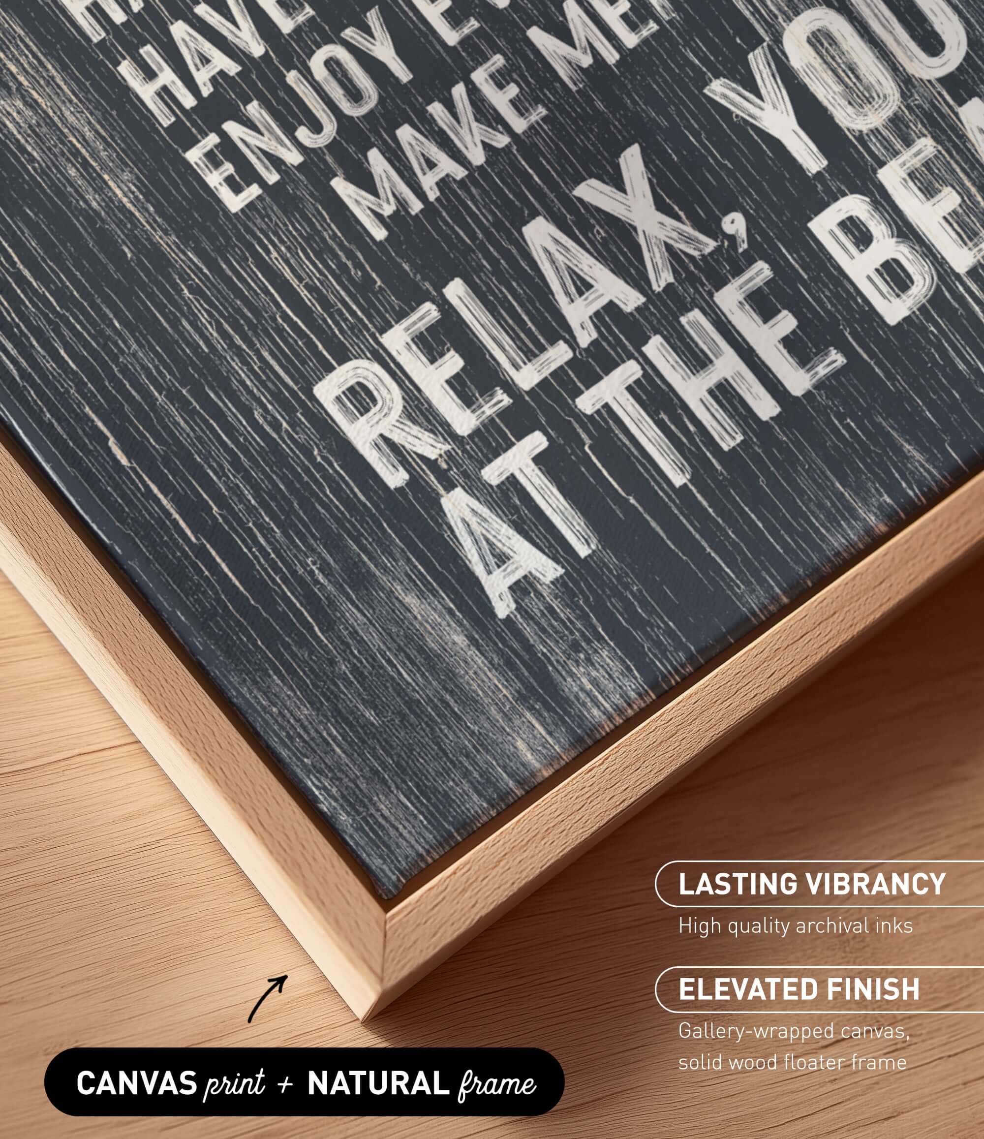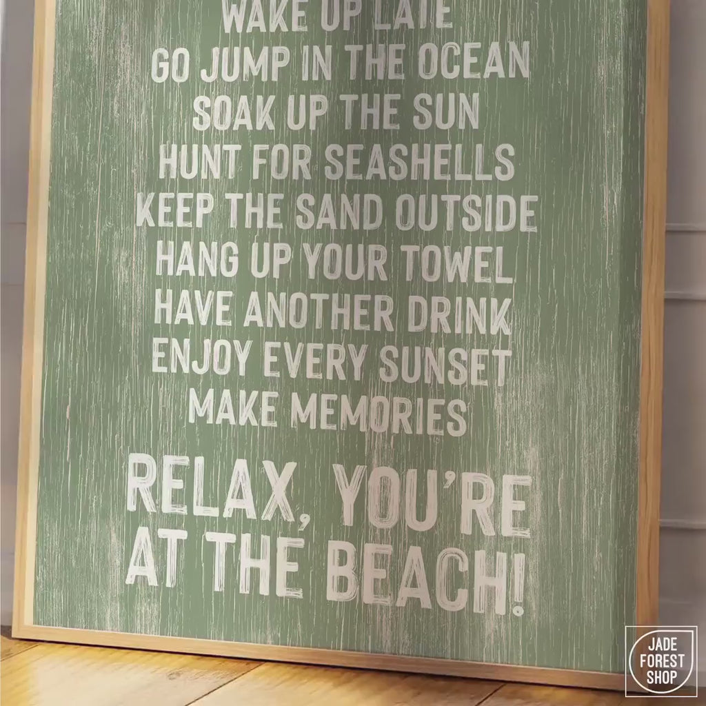 a sign on a wall that reads "BEACH HOUSE RULES" and provides a list of beach-related activities and behaviors, such as "WAKE UP LATE", "JUMP IN THE OCEAN", "SOAK UP THE SUN", "HUNT FOR SEAShells", "KEEP THE SAND OUTSIDE", "HANG UP YOUR TOWEL", "HAVEN DRINK", "ENJOY EVERY SUNSET", "MAKE MEMORIES", and "RELAX. YOU'RE AT THE BEACH!".