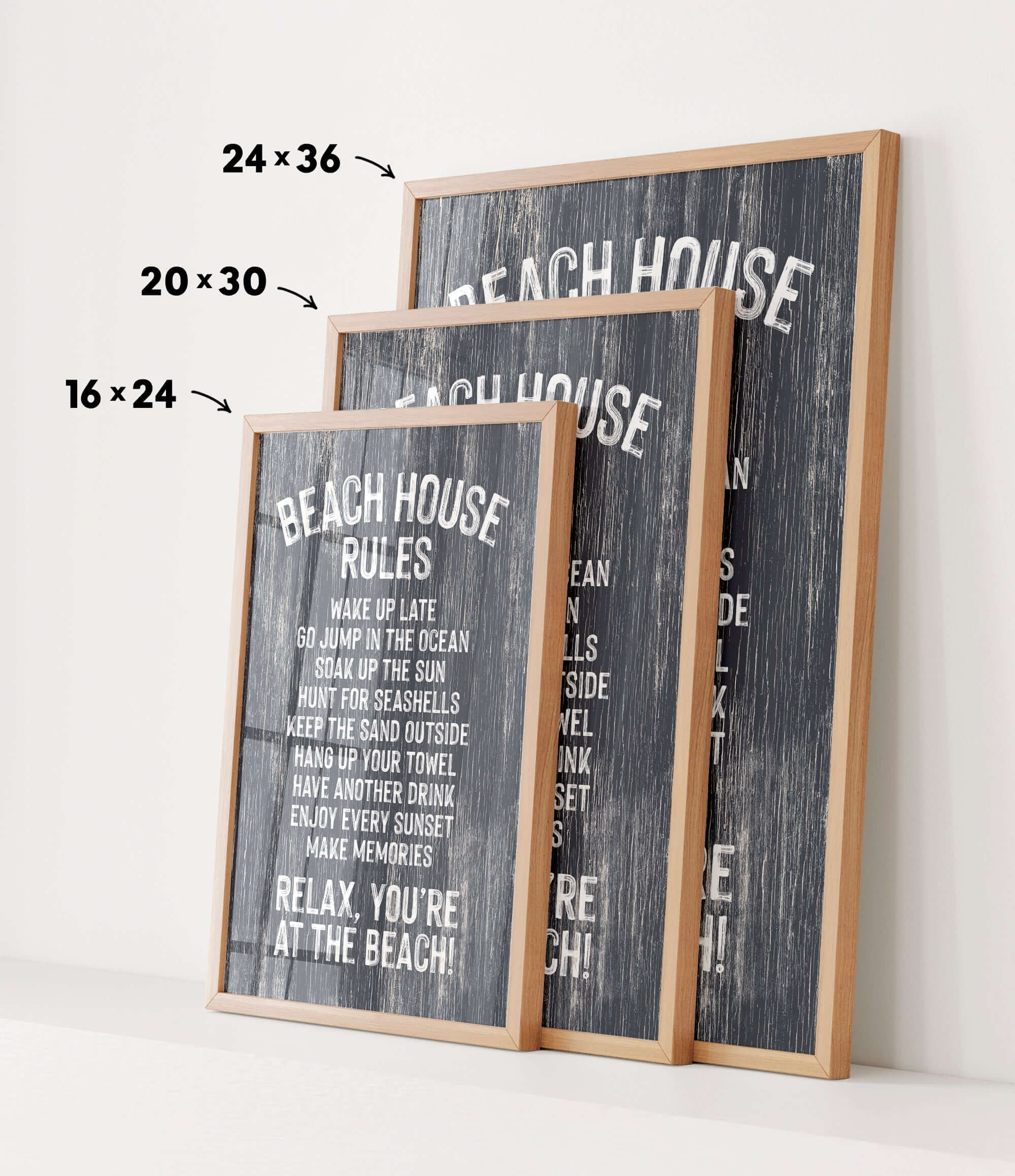 A framed sign with the text "BEACH HOUSE RULES" displayed on a wooden surface, with a plant in the background.