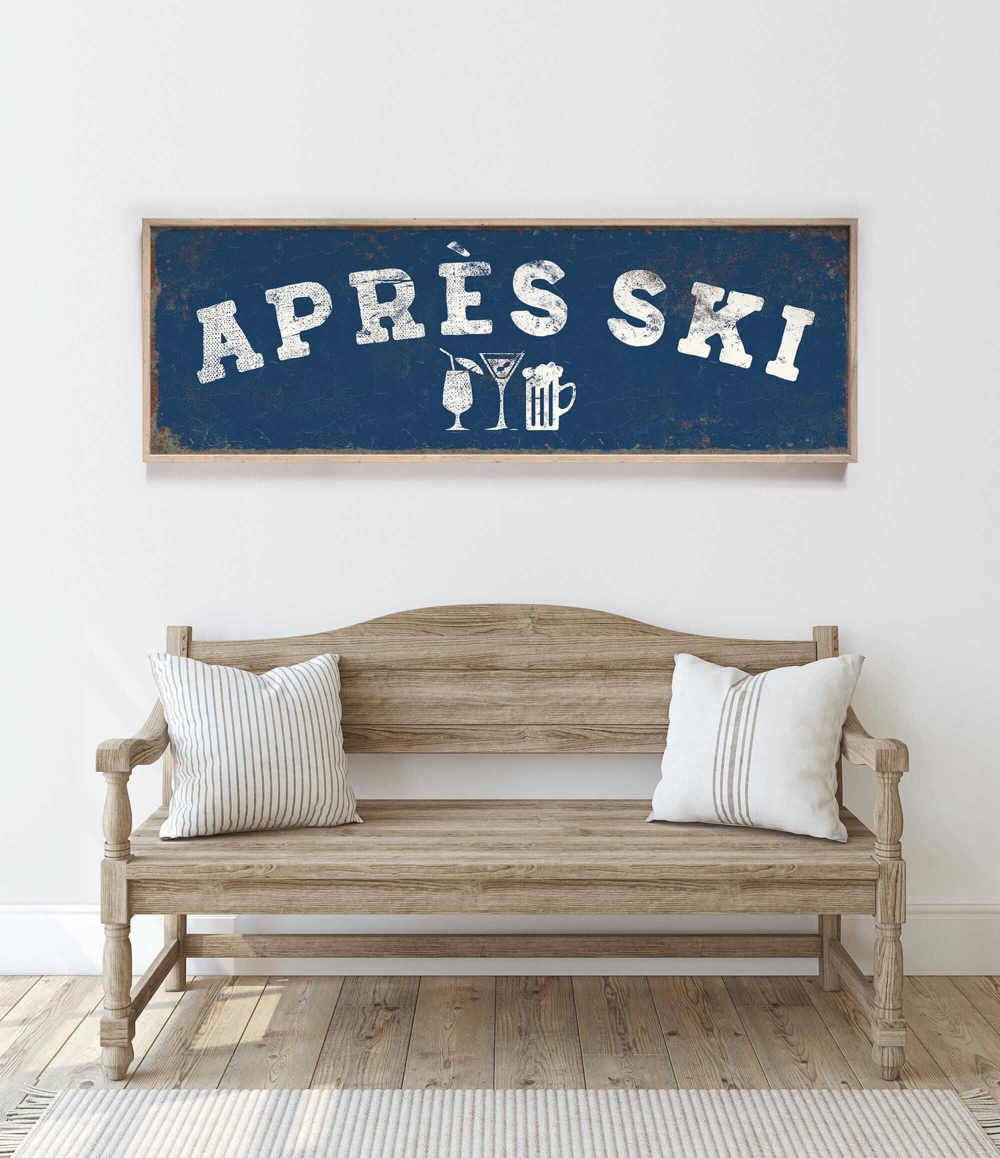 a wooden bench with two striped pillows, and above it is a framed sign with the text "APRÈS SKI" in white letters.