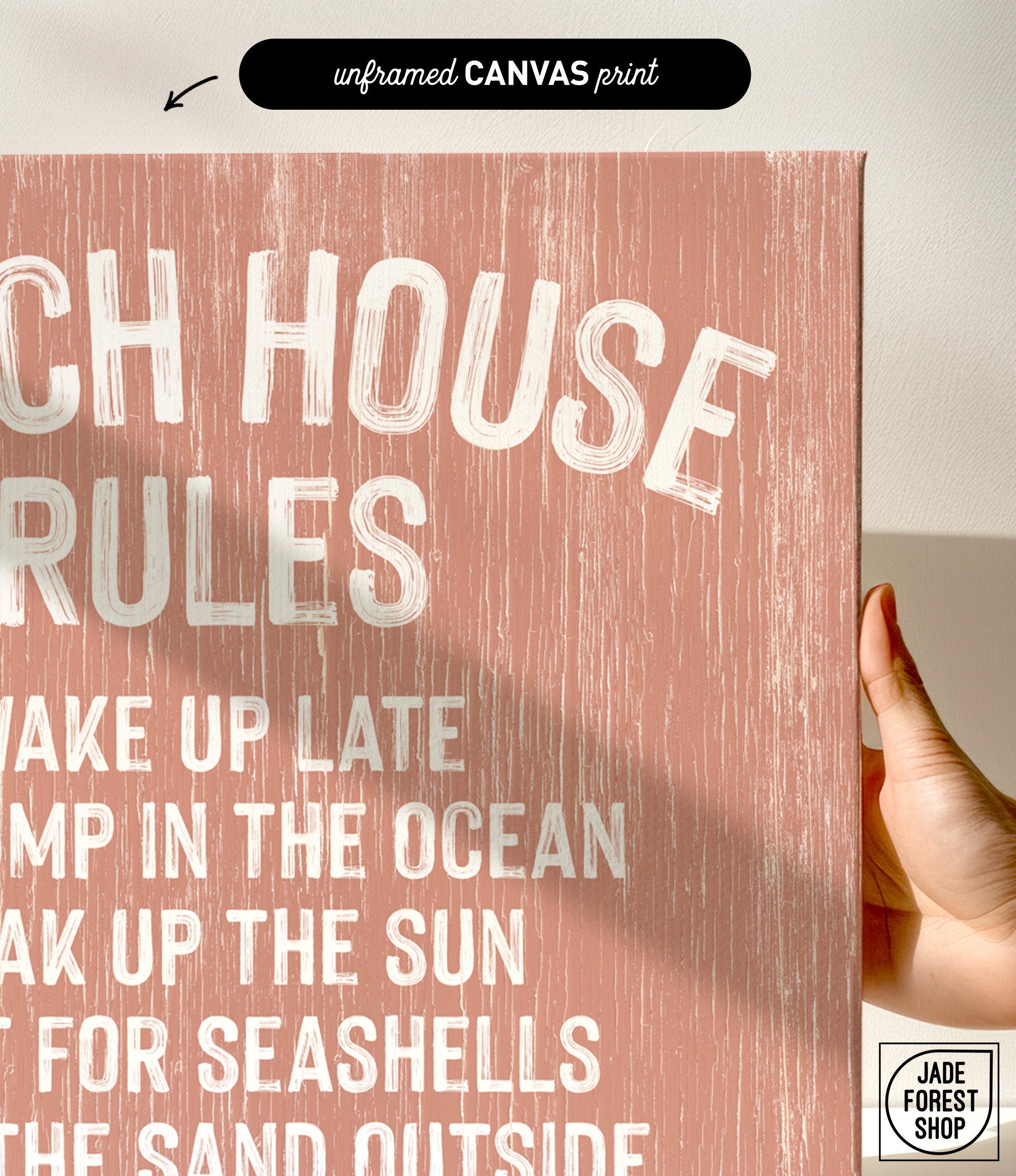 Crafted with high-quality materials, the Beach House Rules Sign is available printed on smooth, clay-coated canvas gallery-wrapped over a 3/4" deep wood frame, heavyweight matte archival paper, or durable, waterproof aluminum with rounded corners. Each option includes hanging hardware for easy installation. The framed versions come in solid maple wood frames with finishes in Black, Espresso, Natural, or Rustic White to complement your modern farmhouse decor perfectly.
