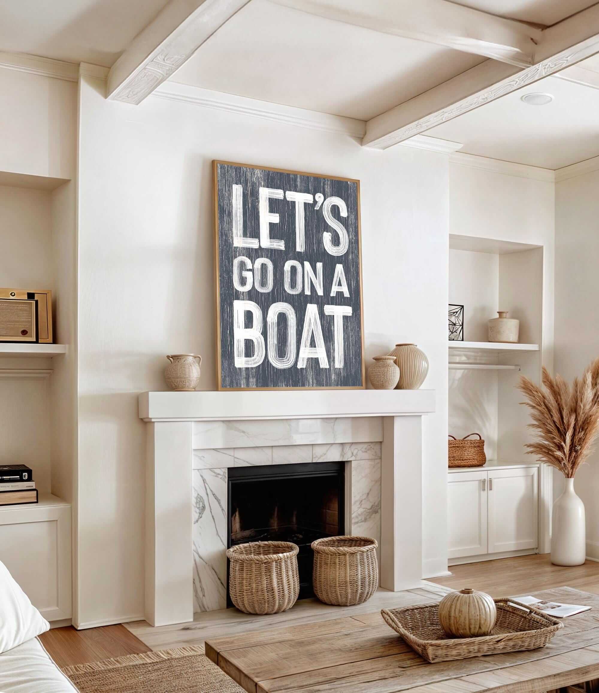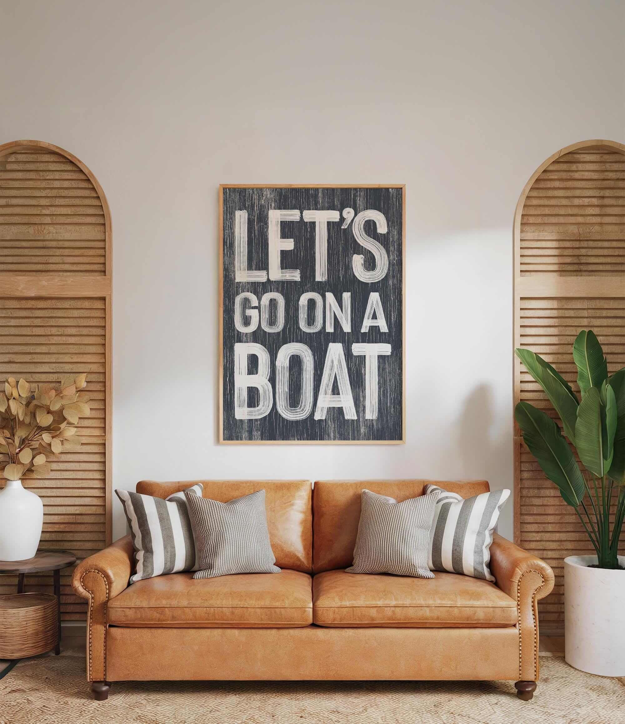 This Let’s Go on a Boat Sign brings coastal charm and retro nautical style to any beach house, lake cabin, or seaside retreat. Featuring distressed texture and classic boat imagery, it makes a striking focal point and a thoughtful gift for boat lovers. Available in canvas, paper, or aluminum for indoor or outdoor display.
