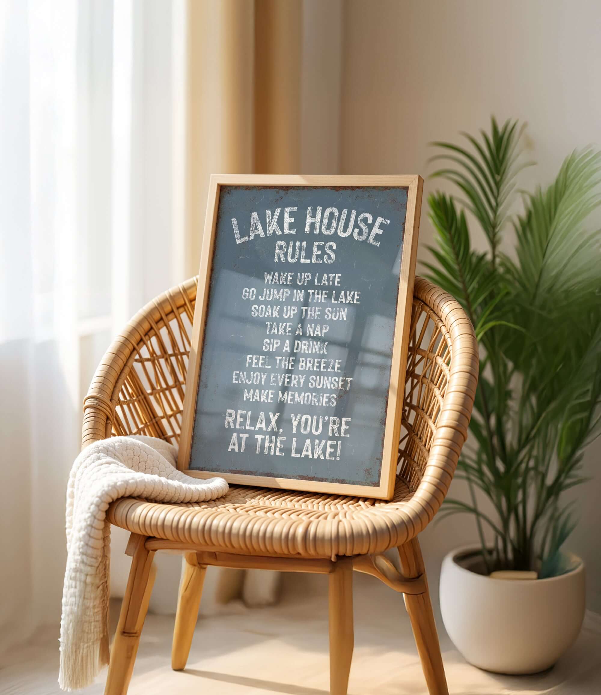 a bedroom with a large sign that reads "LAKESHORE RULES" hanging on the wall. The sign provides a list of rules for guests at the lake, including instructions to wake up late, go for a swim, take a nap, drink a beverage, enjoy the breeze, and relax. The room has a comfortable bed, a potted plant, and a woven basket on the wall, creating a cozy and inviting atmosphere.