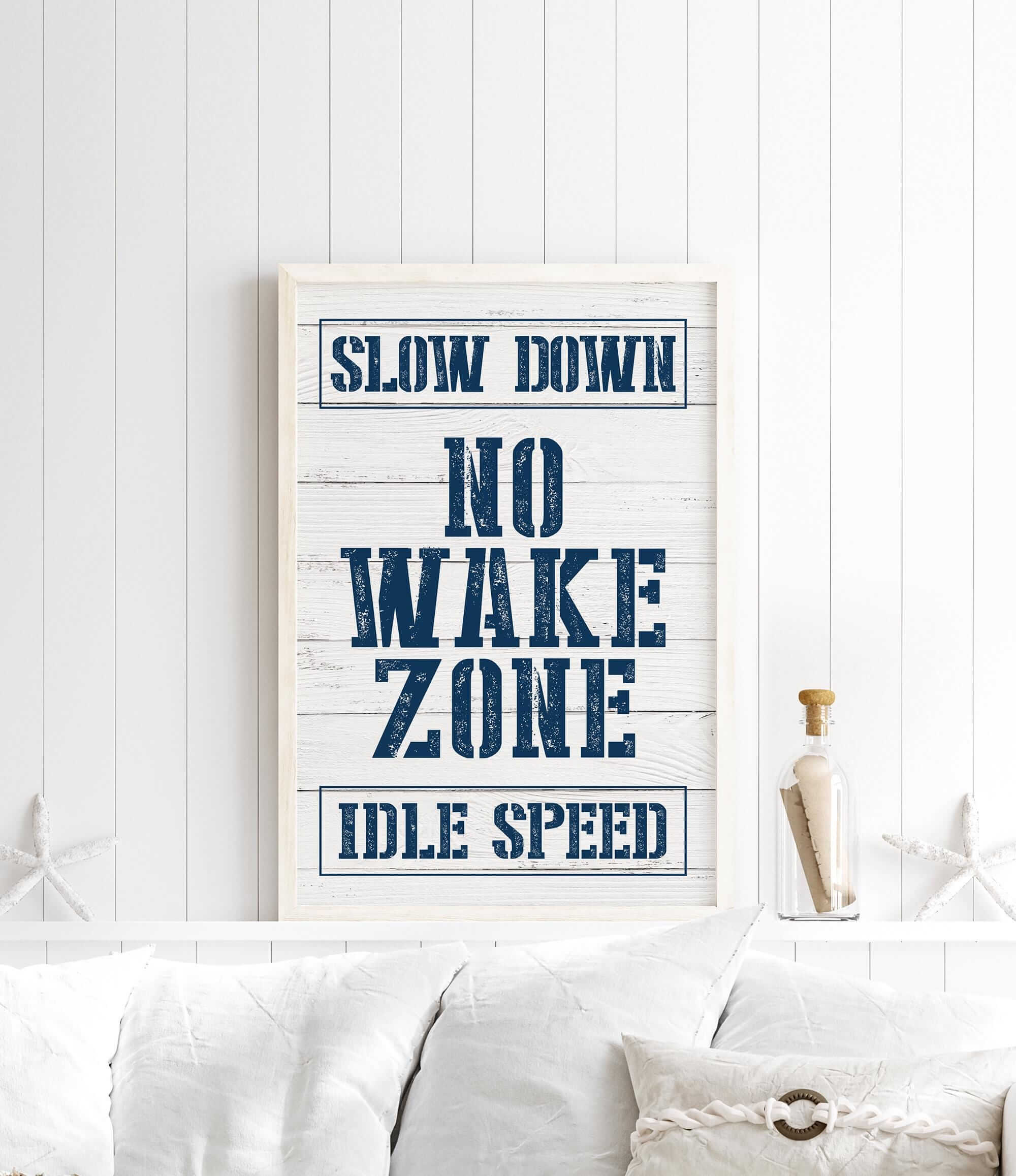 This no wake zone sign is a piece of vintage-inspired coastal art designed to enhance your lake house decor. Crafted as a distressed shiplap decor piece, this retro-inspired decor is perfect for those who appreciate nautical wall art and modern farmhouse style.